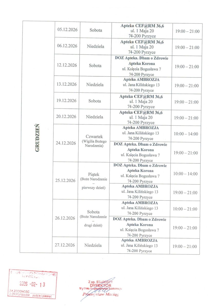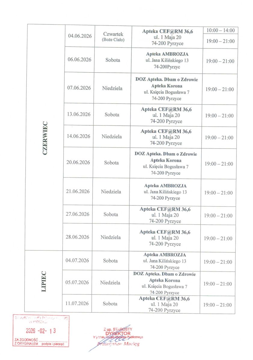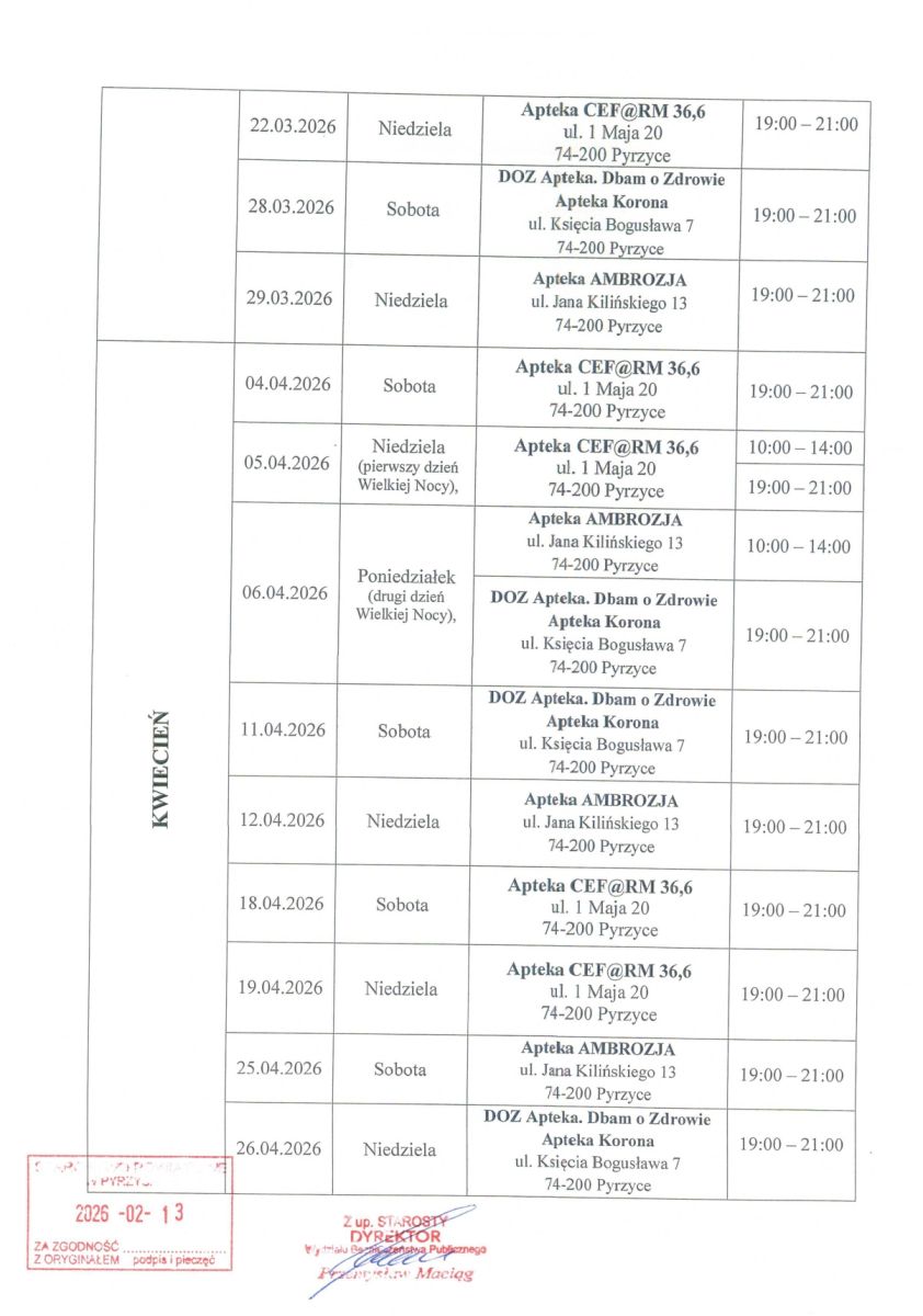 HARMONOGRAM dyżurów aptek ogólnodostępnych na terenie powiatu pyrzyckiego w okresie od 14 lutego 2026 r. do 31 grudnia 2026 r.