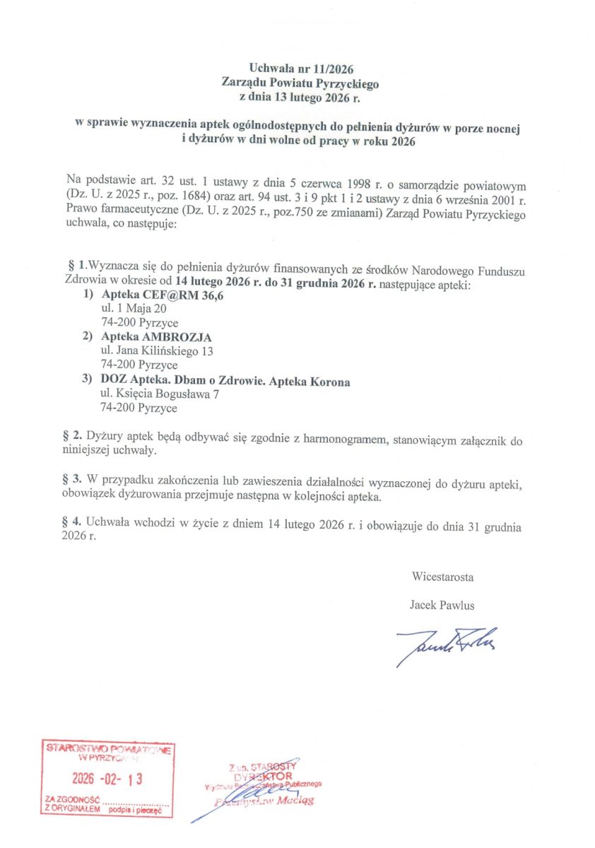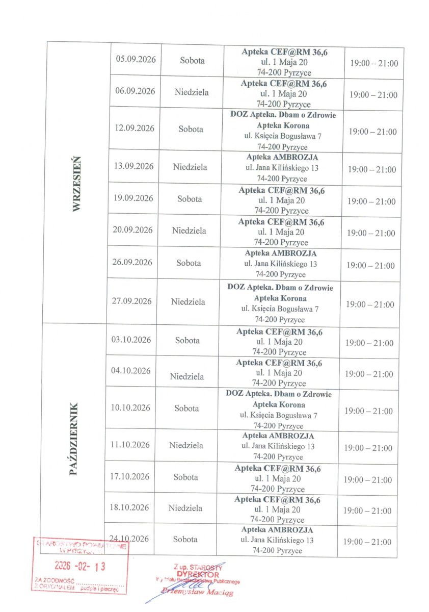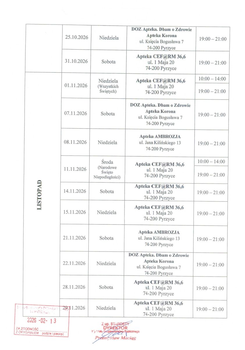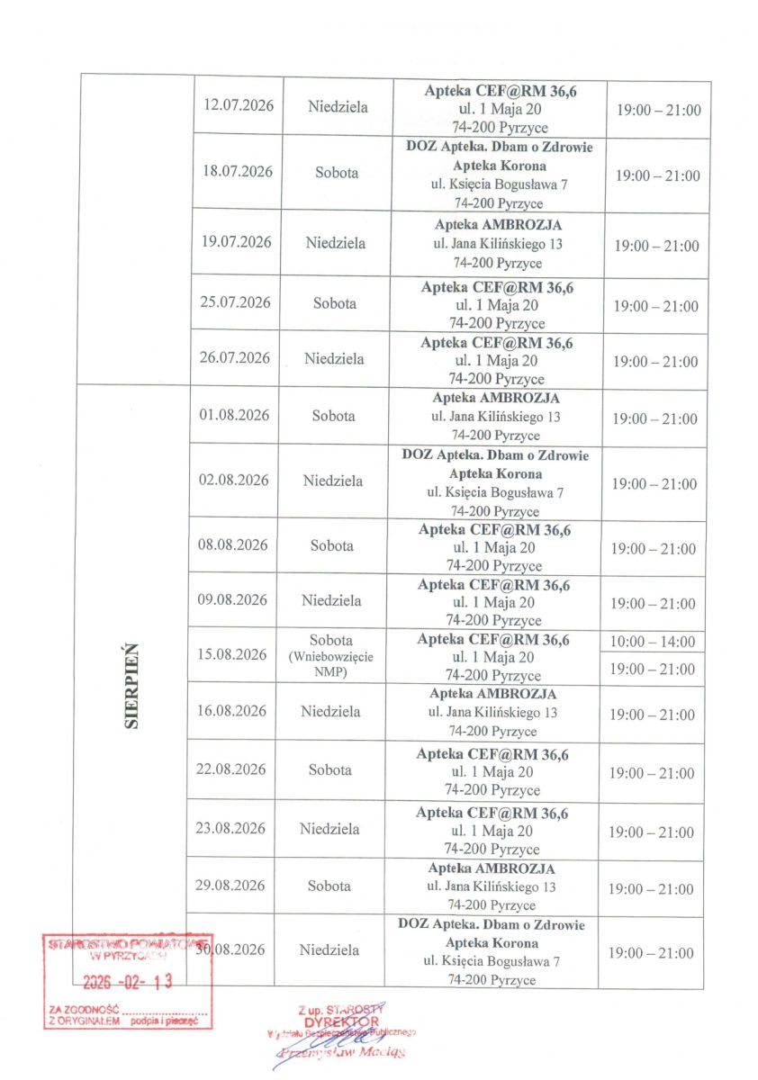 HARMONOGRAM dyżurów aptek ogólnodostępnych na terenie powiatu pyrzyckiego w okresie od 14 lutego 2026 r. do 31 grudnia 2026 r.