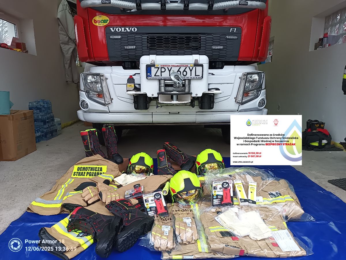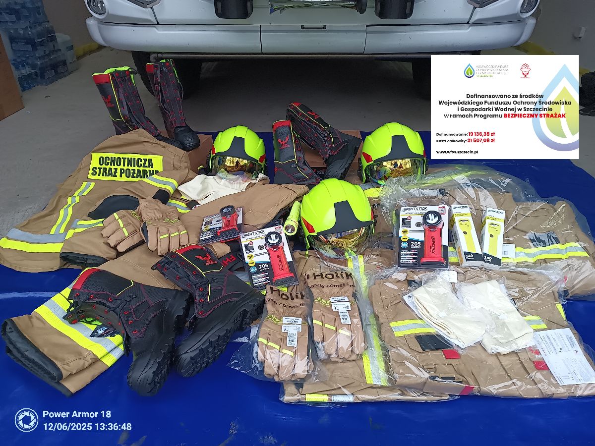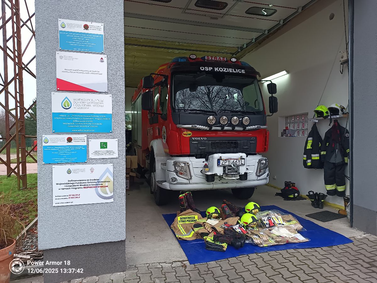 Ochotnicza Straż Pożarna w Kozielicach wyposażona w nowy sprzęt i wyposażenie ochrony osobistej zakupiony w ramach dotacji z WFOŚiGW w Szczecinie w ramach realizacji zadania: Dofinansowanie zakupu sprzętu i wyposażenia jednostek Ochotniczych Straży Pożarnych „BEZPIECZNY STRAŻAK” – 2025. W ramach otrzymanej dotacji w kwocie 19 136,38 zł zakupiono 3 komplety ochrony osobistej strażaka, w skład kompletu wchodzi: ubranie specjalne FHR 008 Max, hełm strażacki CALISIA VULCAN, buty specjalne FHR 006, rękawice specjalne Holik Proline EVO, kominiarka niepalna, latarka nahełmowa NIGHTSTIC i latarka kątowa NIGHTSTIC INTRANT XPP. Koszt całkowity realizacja zadania wyniósł 21 507,09 zł w tym dotacja z WFOŚiGW w kwocie 19 136,38 zł, wkład z budżetu Gminy Kozielice 2 126,27 zł oraz środki własne OSP 244,44 zł. @Wojewódzki Fundusz Ochrony Środowiska i Gospodarki Wodnej w Szczecinie
