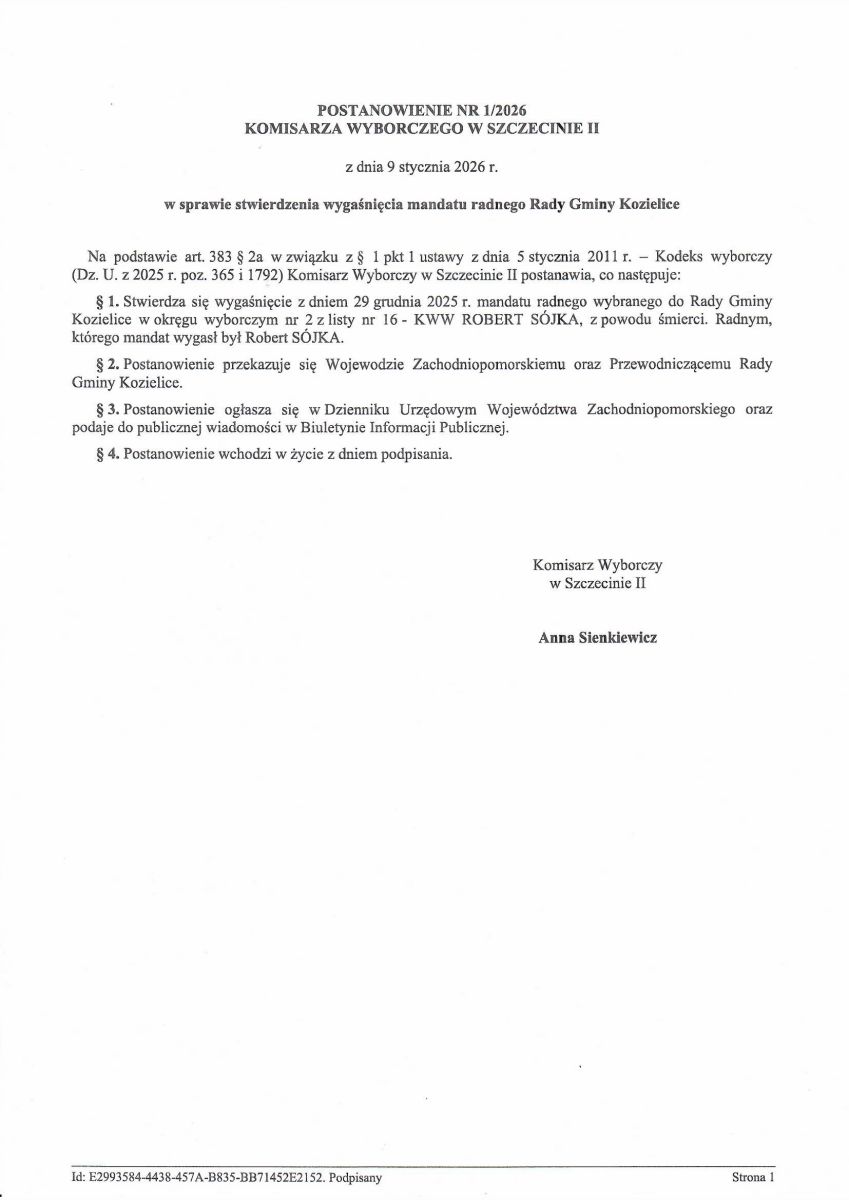 POSTANOWIENIE NR 1/2026 KOMISARZA WYBORCZEGO W SZCZECINIE II W SPRAWIE STWIERDZENIE WYGAŚNIĘCIA MANDATU RADNEGO RADY GMINY KOZIELICE