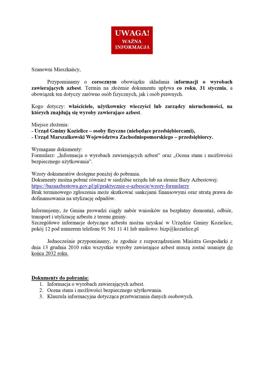 Informacja o wyrobach zawierających azbest (DOC, 35.5 KB)Ocena stanu i możliwości bezpiecznego użytkowania (DOC, 60 KB)Klauzula informacyjna (PDF, 67.24 KB)