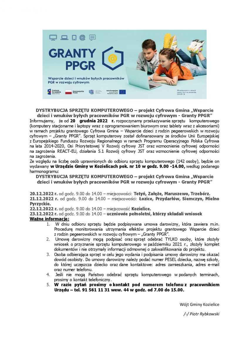 Informacja o dystrybucji sprzętu w ramach projektu "GRANTY PPGR"