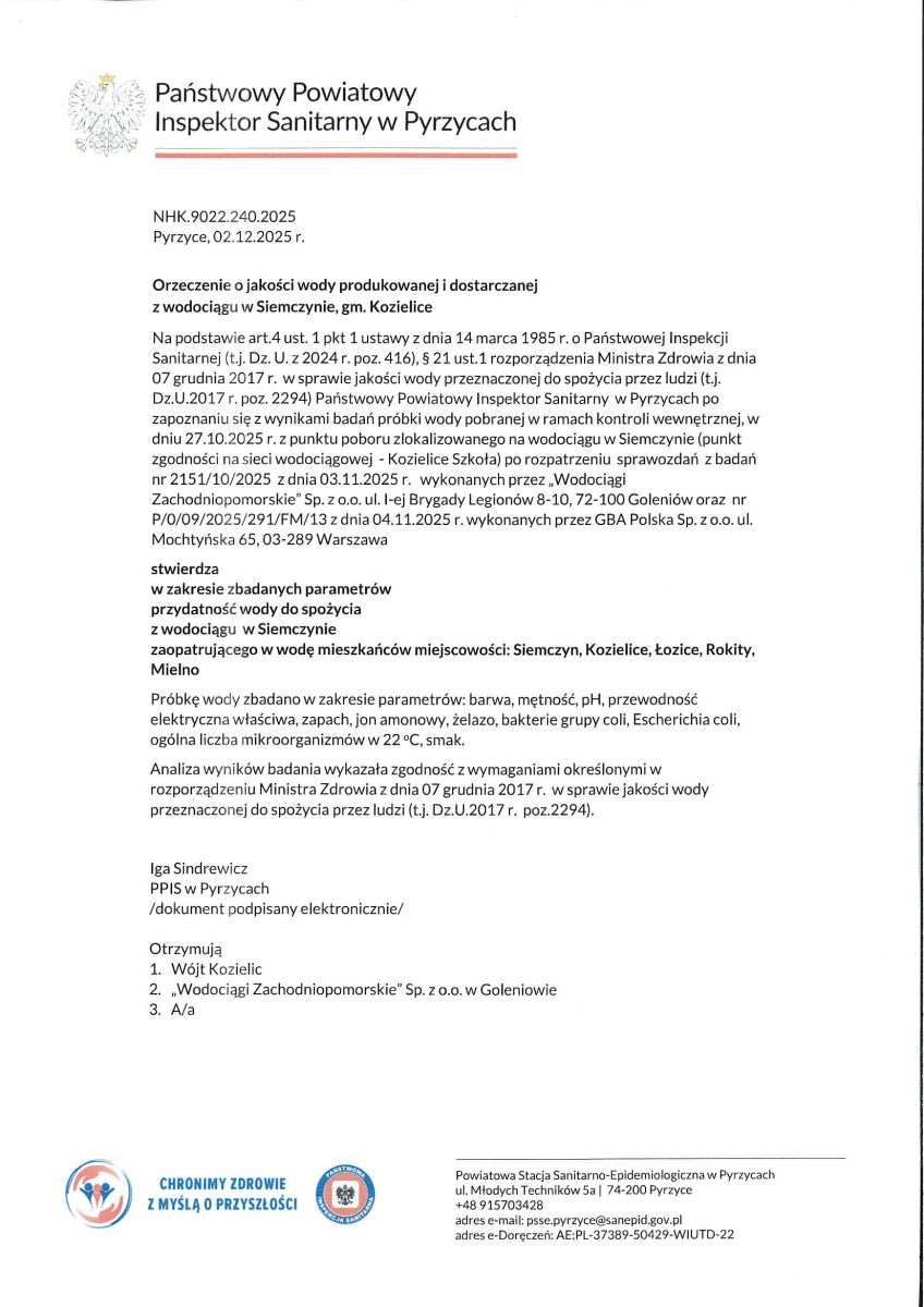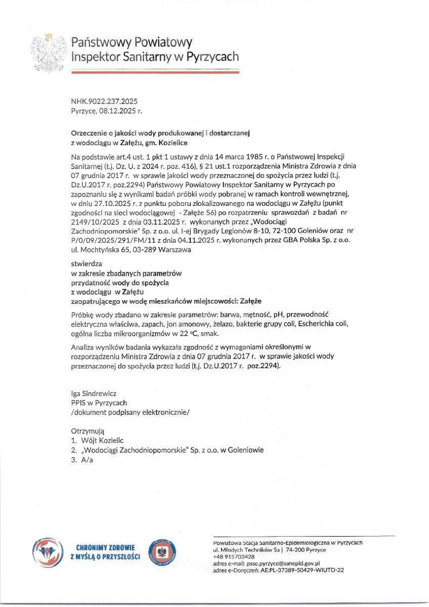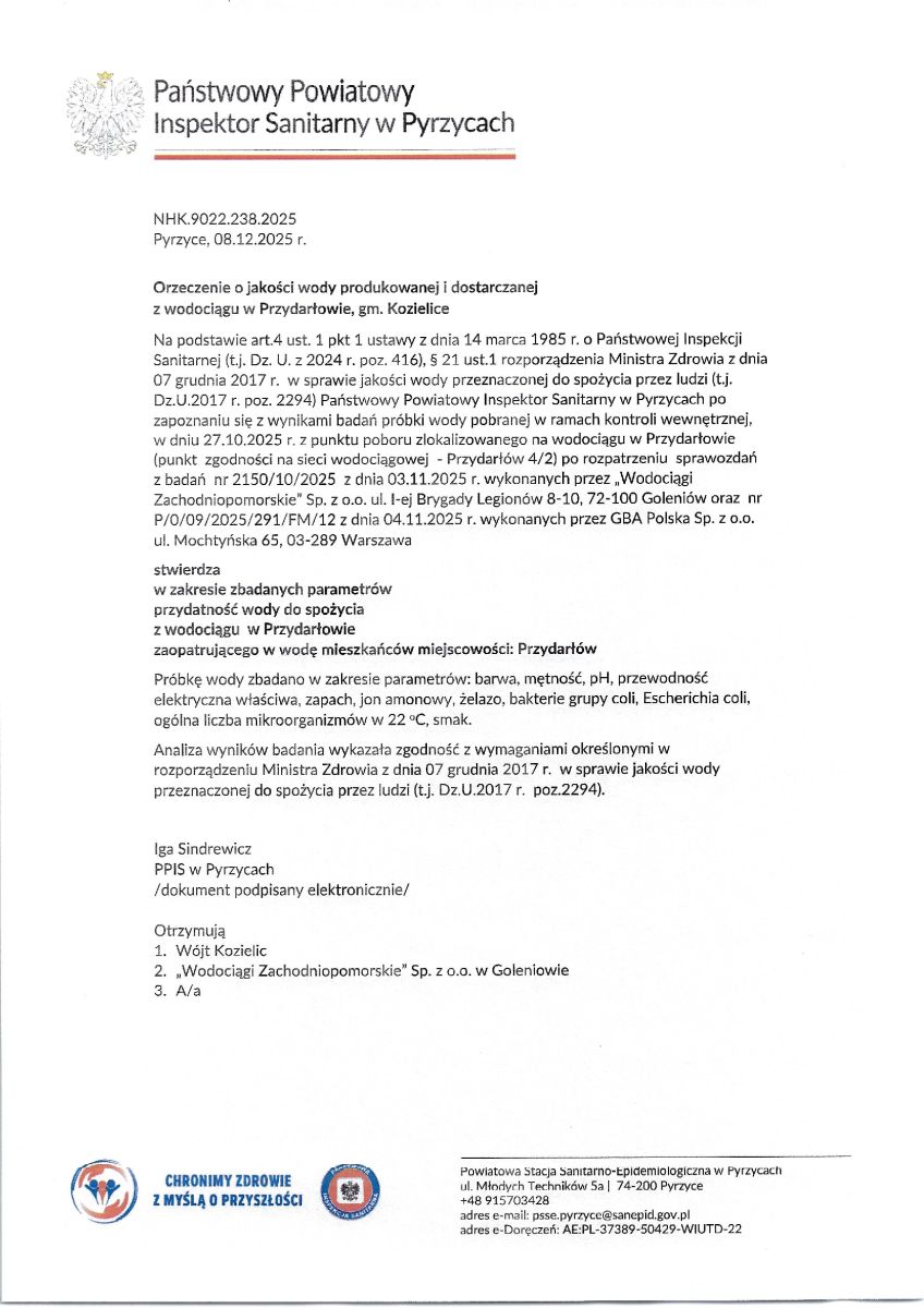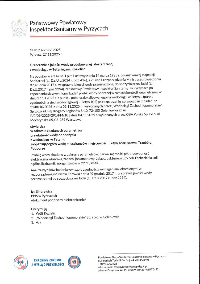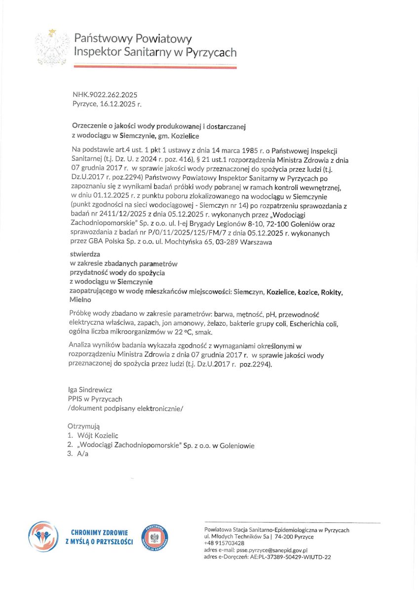 Zgodnie z art. 12 ust. 5 ustawy z dnia 7 czerwca 2001 r. o zbiorowym zaopatrzeniu w wodę i zbiorowym odprowadzaniu ścieków (t.j. Dz.U. z 2015r. poz. 139 z późn. zm.), w nawiązaniu do § 23 ust. 1 pkt 2 Rozporządzenia Ministra Zdrowia z dnia 13 listopada 2015 r. w sprawie jakości wody przeznaczonej do spożycia przez ludzi (Dz.U. z 2015 r. poz. 1989), Wójt Gminy Kozielice zobowiązany jest do informowania mieszkańców o jakości wody przeznaczonej do spożycia przez ludzi.