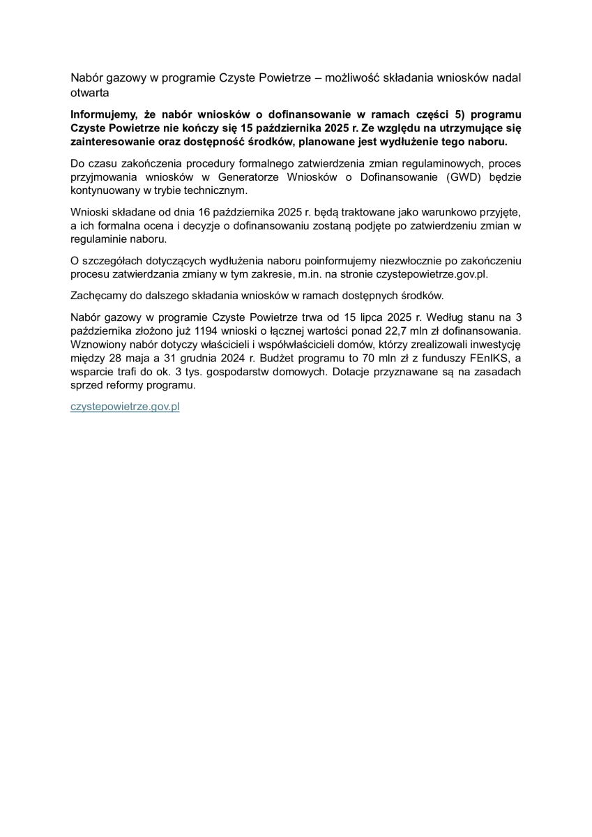 Informujemy, że nabór wniosków o dofinansowanie w ramach części 5) programu Czyste Powietrze nie kończy się 15 października 2025 r. Ze względu na utrzymujące się zainteresowanie oraz dostępność środków, planowane jest wydłużenie tego naboru.